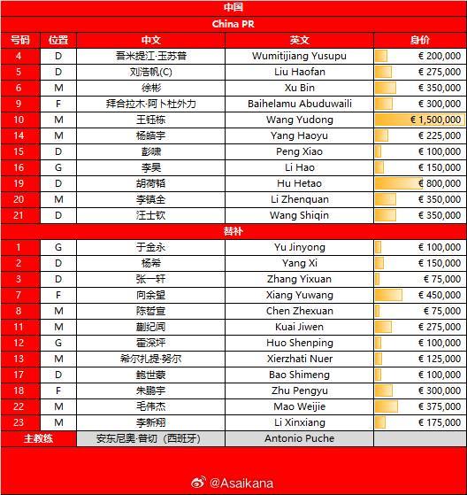 双方首发身价:中国队460万欧元,澳大利亚队382.5万欧元